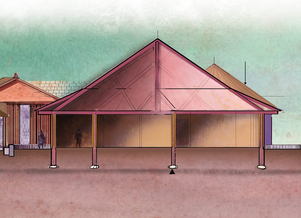 În majoritatea gropilor de stâlpi s-a găsit un număr mare de cuie, piroane și cârlige, unele având la capăt un inel (într-o singură groapă de stâlp s-au găsit, de exemplu, 23 de astfel de piese), care erau cu siguranță înfipte în acești stâlpi și de care se agăța ceva. De asemenea, s-au găsit cantități mari de lut, sub forma unor bucăți frumos lustruite, care se pare că îmbărcau stâlpii din lemn. Cu alte cuvinte, stâlpii nu erau vizibili, ci erau înglobați în pereți, constituind structura portantă a acestora. Existau așadar două încăperi concentrice cu pereți din lut, una circulară, mai mare, și una absidată, în interiorul celei circulare. Acoperișul, de formă conică, a avut învelitoare din șindrilă. Grosimea mare a stratului de cenușă rezultat în urma incendierii construcției arată că acolo a ars o cantitate enormă de lemn.